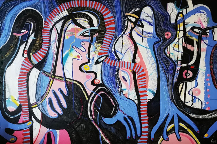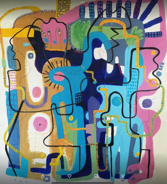 Mijn fascinatie is de mens en haar zoektocht naar verbinding. Met absurdistische tekeningen en vloeiende lijnenspelletjes ga ik op zoek naar connectie met alles in en om ons heen. Ik vermaak deze chaos tot kleurrijke ruimtes om te verdwalen.