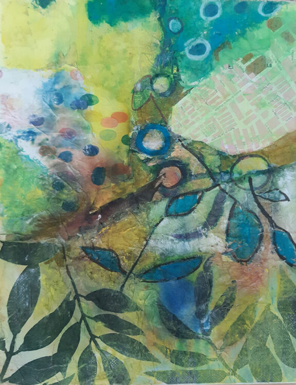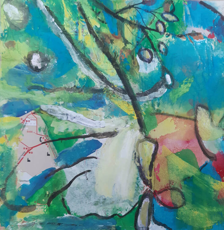 Ik wil graag de verbeelding van de toeschouwer prikkelen door collages te maken met geschilderde vormen, knipsels, landkaarten en losse lijnen. Al dwalend door verschillende fragmenten van het schilderij wordt de toeschouwer meegetrokken in een eigen verbeeldingswereld