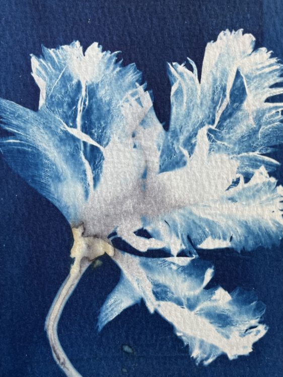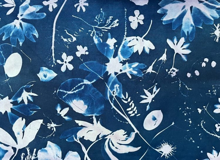 I work in cyanotype, a photographic process that uses chemistry and sunlight to create prints of blue on paper and fabric. I’m fascinated by the beauty inherent in aging flowers and leaves. Anyone can learn this creative technique in my workshops!