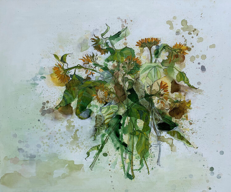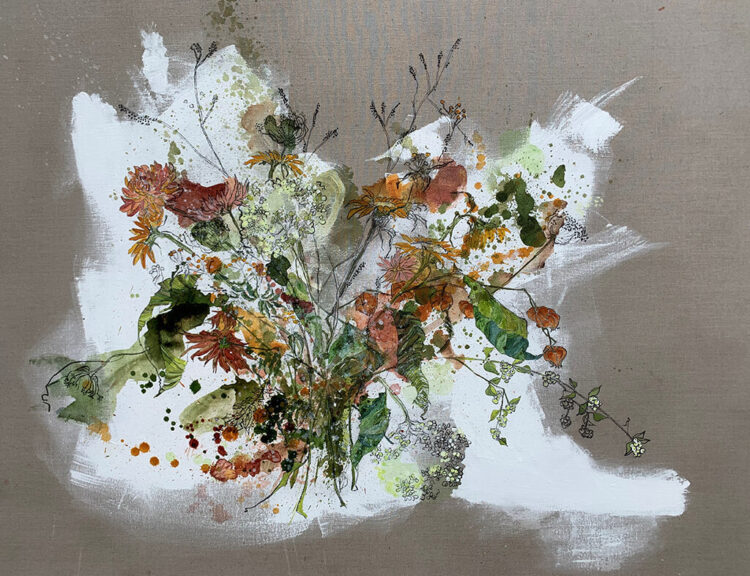 Op dit moment teken en schilder ik boeketten en bloesem en maak ik een eigentijdse vertaling van de bloemstillevens uit de Gouden eeuw. Ik laat de verf druppen en spatten op onbewerkt linnen en teken heel gedetailleerd de bloemen en de bladeren in de verf.