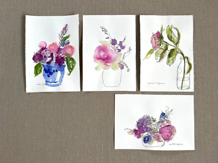Mijn schilderijen zijn vaak groot op onbewerkt linnen. Op moment maak ik ook veel aquarel van flora. Ik schilder met de seizoenen mee. In Spanje geef ik ArtRetreats. Even helemaal los van alle werkzaamheden, de focus op jezelf en je creativiteit.