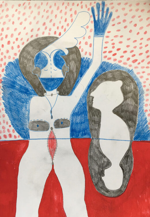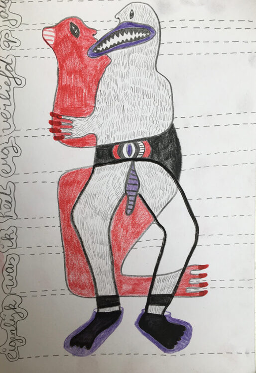 Ik maak kleine en grote tekeningen. Intuïtief laat ik een een hele eigen wereld zien. Half mens half beest figuren die liefdeskoppels zijn. Als een soort van dagboek teken ik mijn gevoelens.